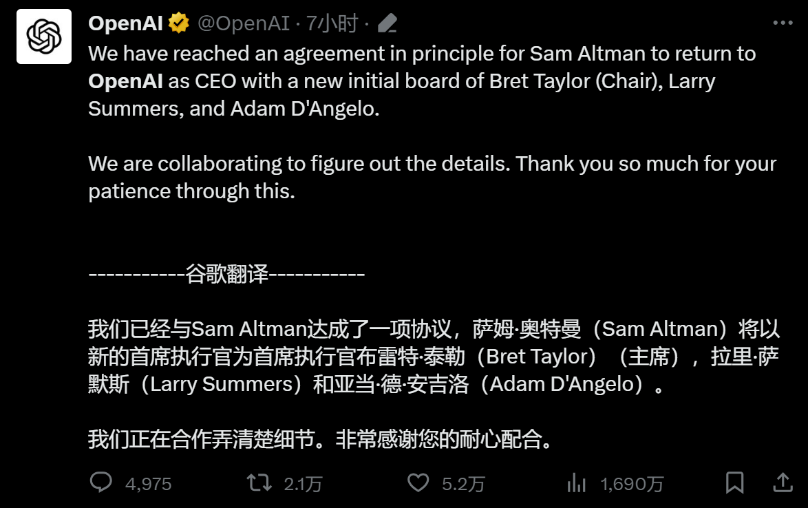 硅谷的一场史诗级夺权大戏落下帷幕!OpenAI官方推特账号宣布,萨姆·阿尔特曼(Sam Altman)回归OpenAI,担任首席执行官,并组建了一个新的创始董事会,成员包括Bret Taylor、Larry Summers和Adam D’Angelo,Bret Taylor担任主席。
