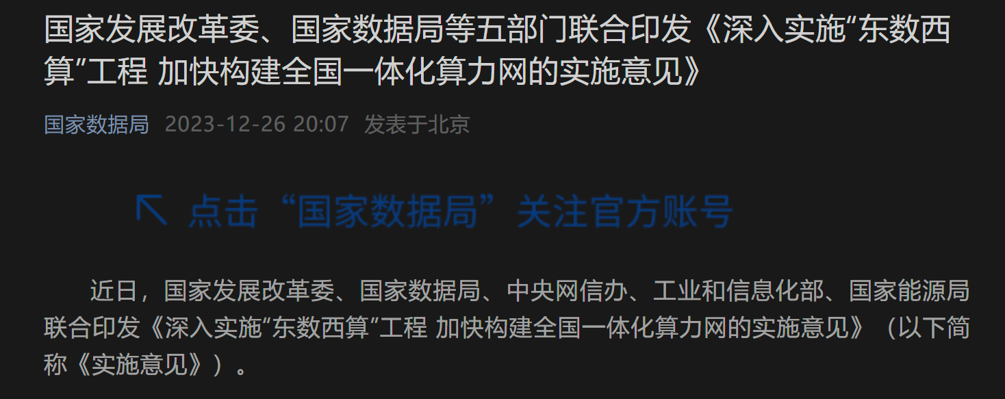 国家发展改革委、国家数据局、中央网信办、工业和信息化部、国家能源局联合印发了《深入实施“东数西算”工程 加快构建全国一体化算力网的实施意见》。根据《实施意见》,到2025年底,综合算力基础设施体系将初步成型。全国各类新增算力中,国家枢纽节点地区将占60%以上,其算力资源使用率将显著超过全国平均水平;1ms时延城市算力网、5ms时延区域算力网、20ms时延跨国家枢纽节点算力网将在示范区域内初步实现;算力电力双向协同机制将初步形成,国家枢纽节点新建数据中心绿电占比将超过80%;用户使用各类算力的易用性将明显提高,成本将明显降低,国家枢纽节点间网络传输费用将大幅降低;算力网关键核心技术将基本实现安全可靠,以网络化、普惠化、绿色化为特征的算力网高质量发展格局将逐步形成。