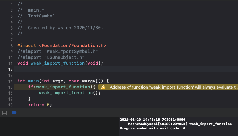 在其他文件中使用,声明 `void weak_import_function(void);` 也可以不声明,配置连接器参数:```objectivec//告诉编译器 指定符号未定义,需要链接器动态查找,编译不检测是否定义OTHER_LDFLAGS=$(inherited) -Xlinker -U -Xlinker _weak_import_function
