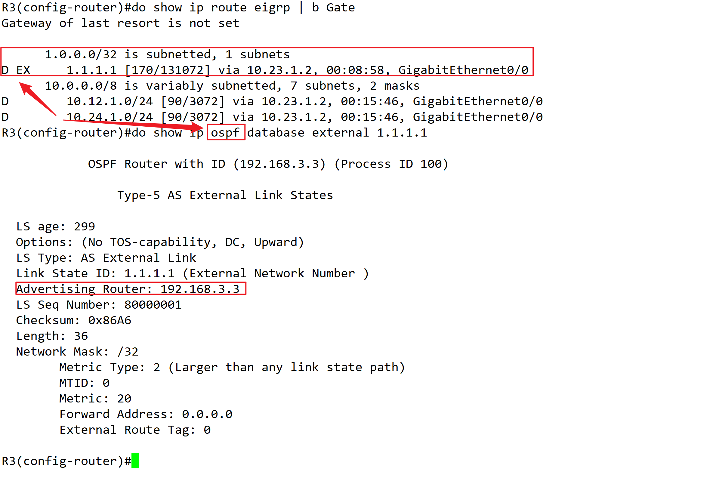 - 查看R3,此时路由表中1.1.1.1 是从EIGRP的重分布学到的