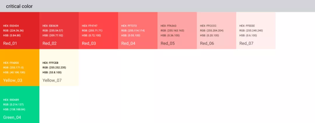 调色板的各个色值(hex value)是最底层的基础样式,我们将色板上的颜色进行规则化命名,以方便后期将其引用到颜色变量中。