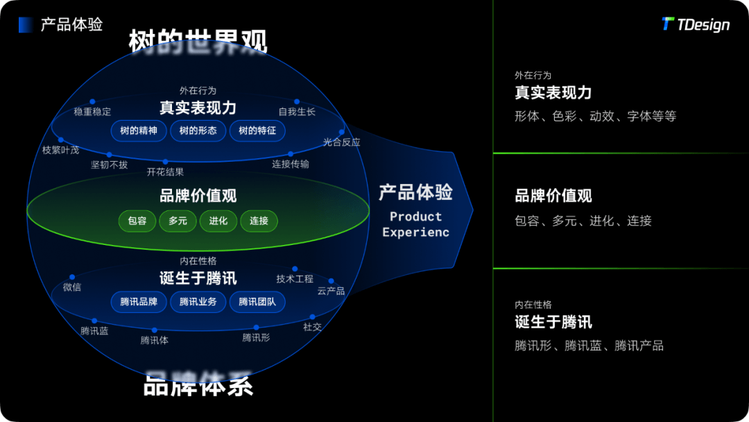 从“内在性格”和“外在行为”拆解并转译。内在性格指意 TDesign 是诞生于腾讯的树,离不开腾讯的根基的业务,团队,以及强大的品牌背书。通过品牌价值观连接我们的内在和外在,成为最坚实的桥梁。外在行为指意是一棵有真实表现力的树,需要有树的精神、树的形态和树的特征。最后 TDesign 孕育出不同领域的解决方案,例如云产品、智慧零售、政务、地图、文旅和医疗等等行业,形成一棵枝繁叶茂的树。