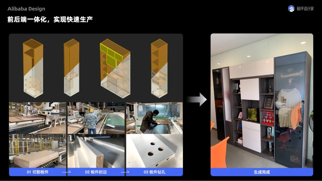 在工厂生产,系统会自动将板件复杂的连接自动标注出来,我们让设计师只关注产品的外观与功能,做到化繁为简,对接生产,最终将一个柜体生产出来。