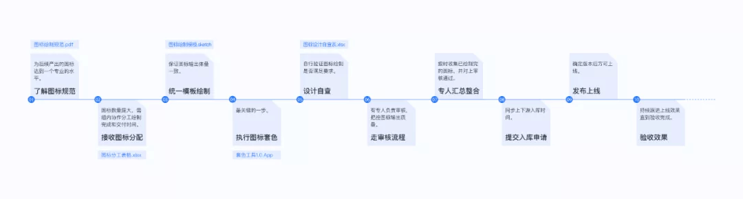 为了更好地协作绘制图标,我们制定了规范化的流程。这个流程可以帮助我们严格管控好每一环节,规范好每一步,让每一位同学都能快速上手,了解绘制图标的工序,规范地展开工作,最终完成图标绘制任务。
