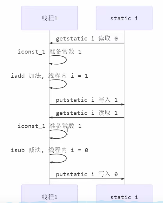 getstatic i //获取静态变量i的值iconst_1 //准备常量1isub //自增putstatic i //将修改后的值存入静态变量i