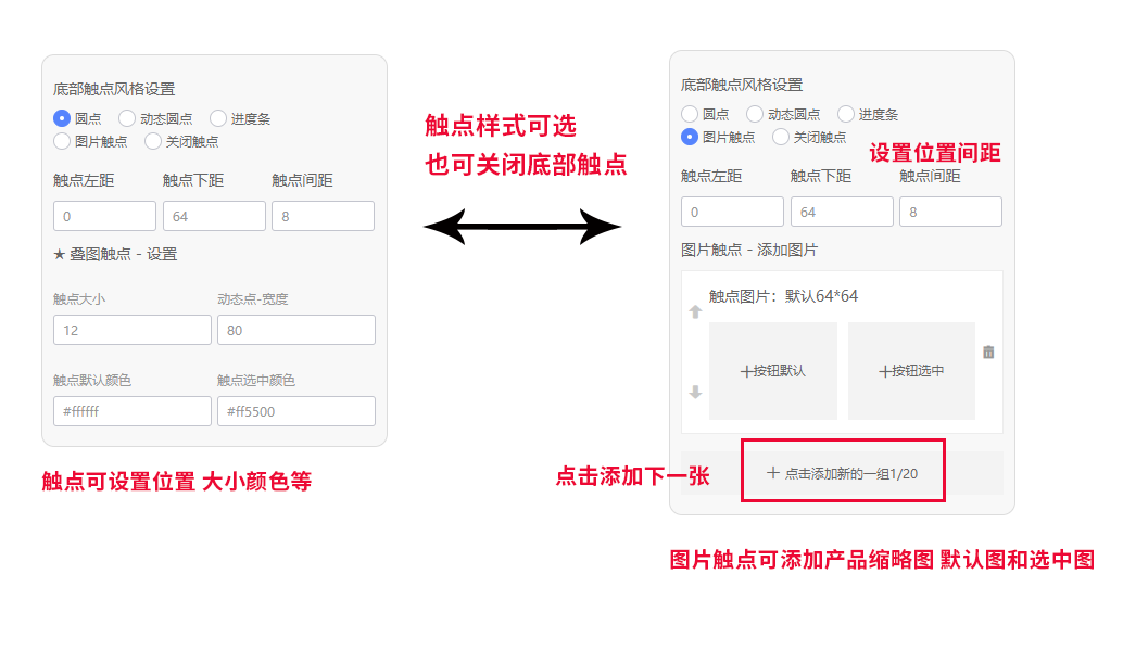 触点多种样式可选,可设置距下位置 设置位置,里面有图片模式,可上传图片产品缩略图,也可隐藏,可不设置