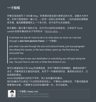 和我一样喜欢酗酒的 Anne Lamott 的写作建议:先写下眼前已经明确的,最想说的那个点子,不要考虑全文最后的呈现,先写下一句最想说的话,最想表达的点子,已经成型的想法。