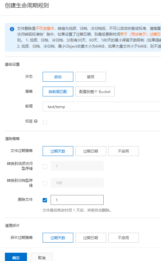 生命周期规则配置完成24小时内会被加载,加载后的24小时内会被执行,请确认无误后再保存规则。