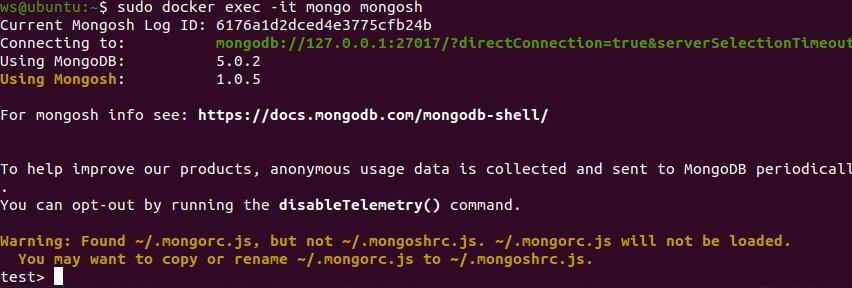 1 拉取docker容器2 启动mongo3 进入容器 1 拉取docker容器 sudo docker pull mongo 2 启动mongo docker run -d —name mongo -p 27017:27017 mongo 参数说明: -p 27017:27017 :映射容器服务的 27017 端口到宿主机的 27017 端口。外部可以直接通过 宿主机 ip:27017 访问到 mongo 的服务。 3 进入容器 docker exec -it mongo mongosh