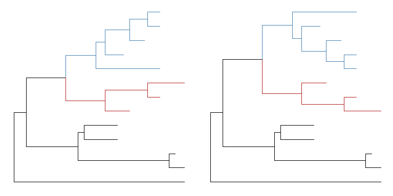 Of course,scaleCladecan acceptscalelarger than 1 and zoom in the selected portion.plot_grid(ggtree(tree) + geom_hilight(17, fill="steelblue") +geom_hilight(21, fill="darkgreen"),ggtree(tree) %>% scaleClade(17, scale=2) %>% scaleClade(21, scale=0.3) +geom_hilight(17, "steelblue") + geom_hilight(21, fill="darkgreen"),ncol=2)