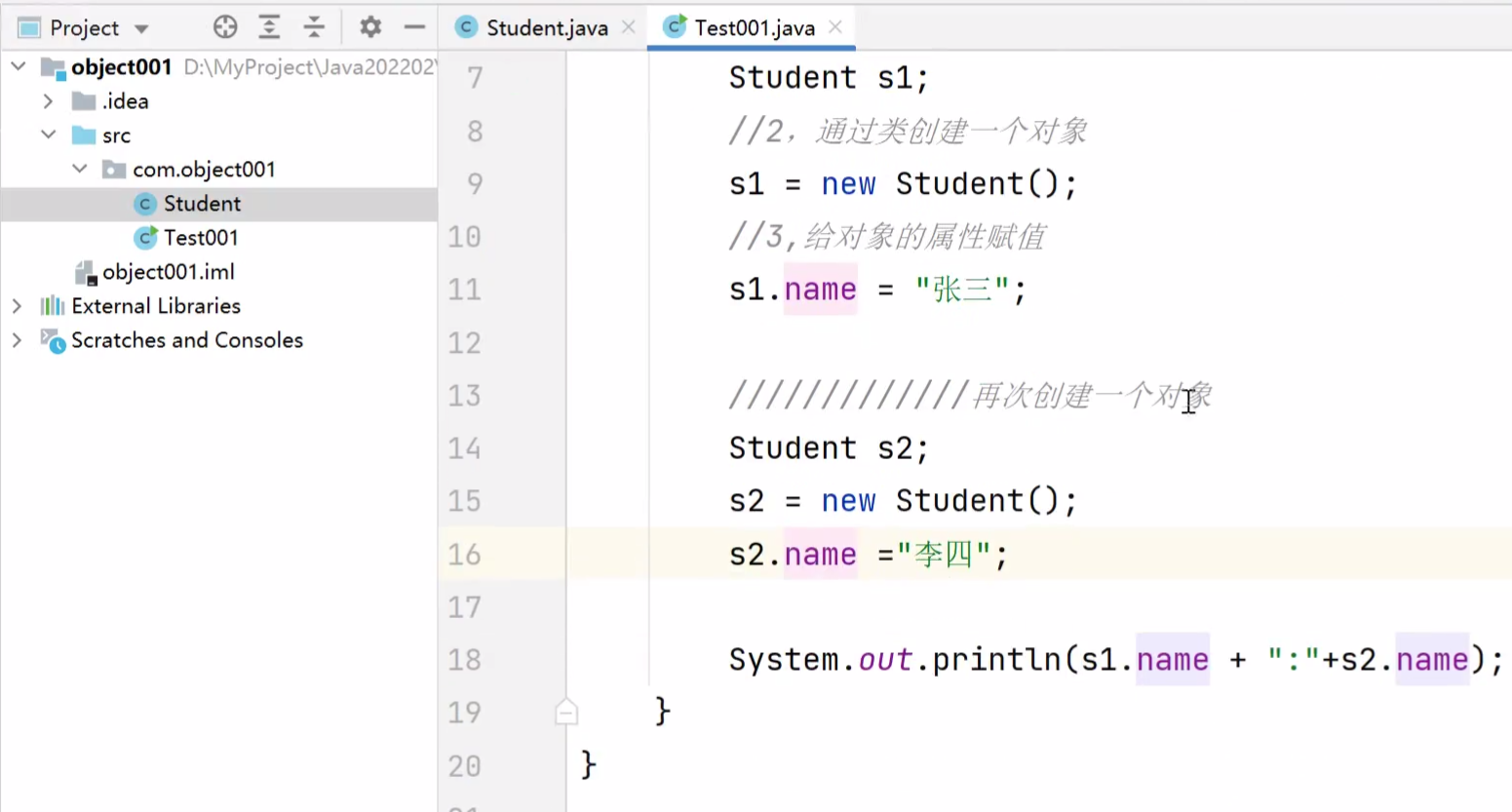 —>包中建类class(命名按实际对象命名)创建一个具有共性的类(Student学生)