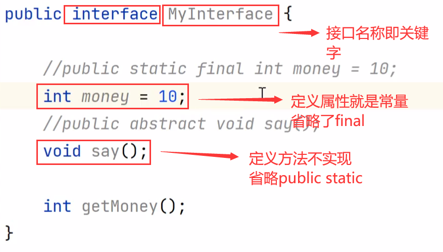 public interface MyInterface{//定义常量,public static final可以省略//全:public static final int money=10;int money=10;//定义抽象方法,public abstract可以省略//public abstract void say();void say();//封装方法int getMoney();
