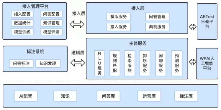 逻辑层架构上,闲聊服务、预测服务、排序服务等各个微服务依赖于WPAI人工智能平台实现多种算法实验模型。主体服务通过借助ABTest实验平台日晷的多层实验实现多种策略、多种算法模型的同时在线实验。这样的架构设计实现了模型的灵活迭代、快速AB实验,方便问答效果的持续提升。数据层包括问答数据、编辑运营数据、以及知识库数据,依赖于数据层数据可生成意图识别模型、问答模型,实现对用户问题的自动问答。数据层的操作管理主要通过标注系统和接入平台系统来实现。其中,标注系统主要面向编辑人员,支持线上问题的评测标注、知识库扩充标注、以及编辑运营等功能。接入平台系统主要面向业务接入方,支持业务接入、知识库建设、数据反馈等功能。
