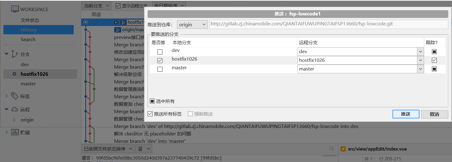 这个是选择某些功能发布时使用,首先切换到master分支,点击分支,复制要提交的部分,打开命令行模式输入以上编码,ad选择hotfix0908,构建,测试,和代码到master