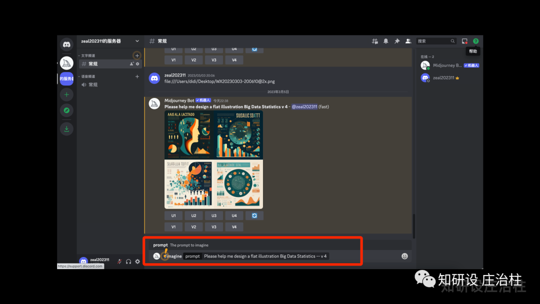 比如你可以对MidJourney,输入你的描述“Please help me design a flat illustration Big Data Statistics”,就会得出你希望的4张图片,如果不满意还可以刷新继续生成