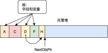 图 21-1 展示了包含三个对象(A,B 和 C)的一个托管堆。如果要分配新对象,它将放在NextObjPtr 指针指向的位置(紧接在对象 C 后)。