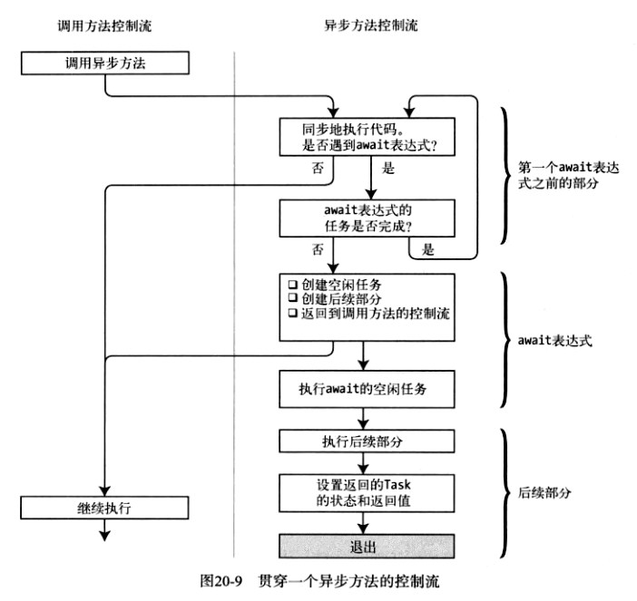 目前有两个控制流:异步方法内的和调用方法内的。异步方法内的代码完成以下工作: