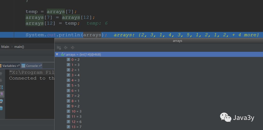 int temp;if (arrays[1] > arrays[0]) {//如果第二个数比第一个数大,直接跟上} else {//如果第二个数比第一个数小,将第一个数后退一个位置(将第二个数插进去)temp = arrays[1];arrays[1] = arrays[0];arrays[0] = temp;}System.out.println("公众号Java3y" + arrays);