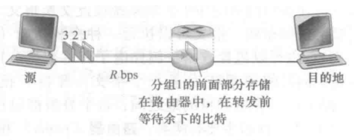 源在时刻0开始传输,在时刻L/R秒,该路由器刚好接收到整个分组,并且朝着目的地向出链路开始传输分组(这里暂时先只考虑传输时延);