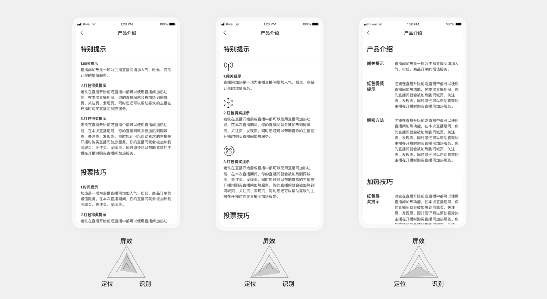 找的体验需要突出关键信息,反差大,快速找到重要信息;读的体验要注意节奏、字的属性、字间距、行间距等等,以及对于文案的写法