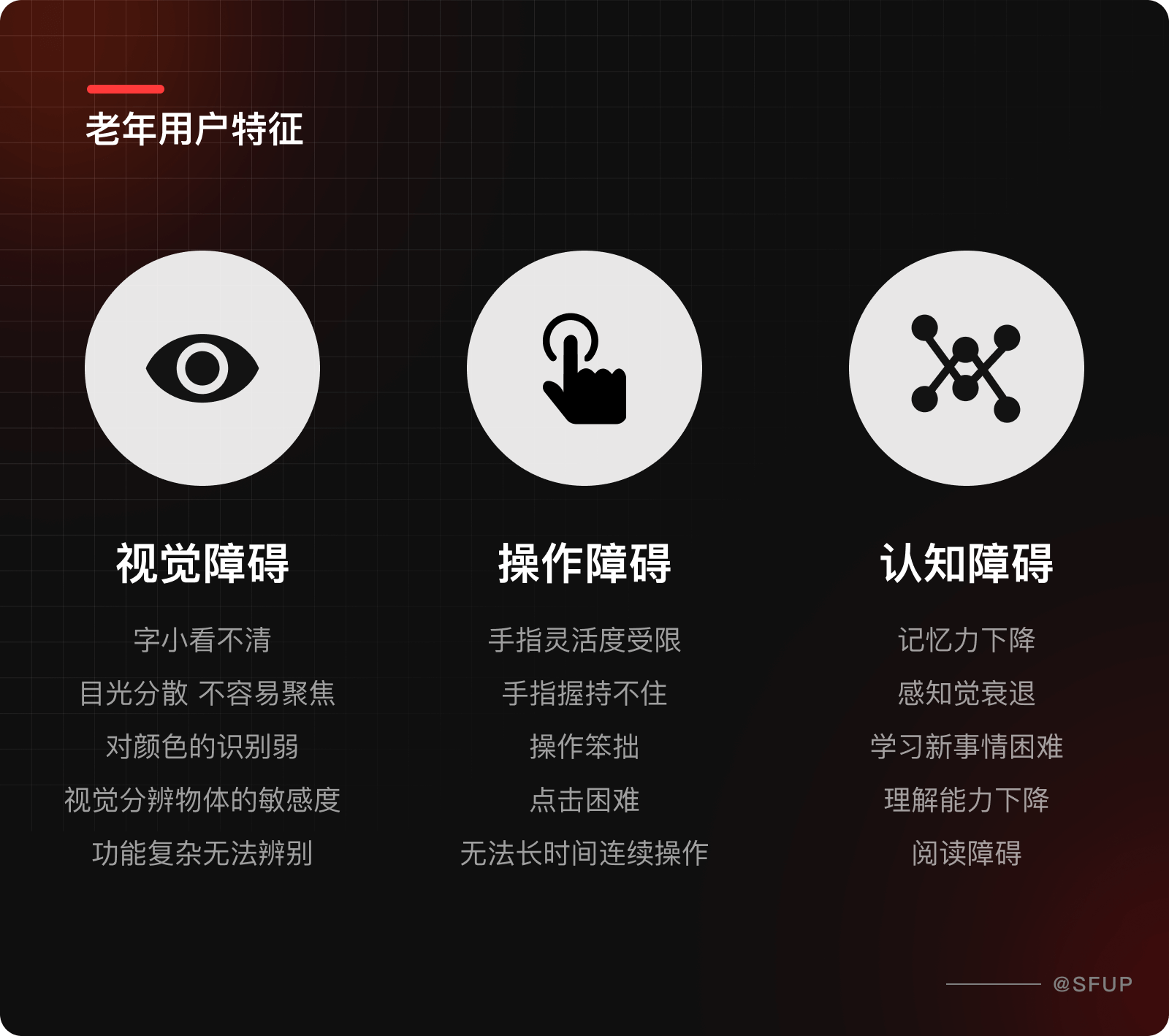 个体在进入老年期后,老年群体的生理特征和认知能力会出现不同程度的退行性变化,从而影响生活质量。这些特征可以划分为视觉障碍、操作障碍和认知障碍。