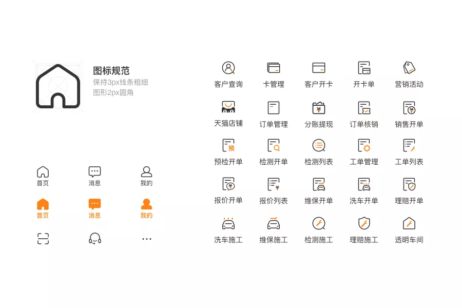 1.图形规范在汽车后市场商业操作系统中,新康众-F6聚焦做B类业务,直接服务对象是B类商户,业务细分为洗车、接车、维修、保养等,这些都具有一定的B类特质,故在APP业务常规图标的表达上,选定了扁平弱对比的设计规范,塑造B类场景商户的沉稳性及简约感。