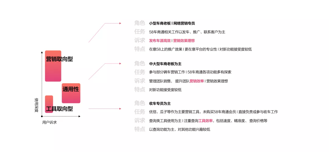 通过用户走访,我们清晰定义了多样性、角色化的⻋商通用户类型及核心功能取向 。用户类型主要包括了:营销取向型 、通用型 、工具取向型。
