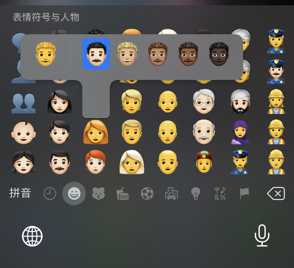 我们现在已经知道 Emoji 是如何通过组合不同的字符来得到新的 Emoji,而这里的魔力就是 ZWJ。上面提到的规则就涵盖了我们在 Emoji 键盘中绝大多数 Emoji 的组成规则。接着,我们再来看看长按 Emoji 键盘的表现。图片中我以一个卷发男人的 Emoji 为例,长按后可以得到另外的 5 种颜色。