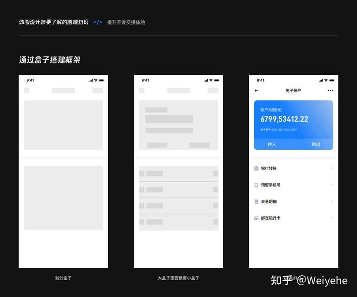 在第一个盒子里面我们放置:账户余额、金额、转入转出按钮,在第二个盒子里面我们可以放置各个4功能列表。这有点类似于我们在画原型图,但是如果我们换成代码的语言,那么这就是前端开发所做的事情了~