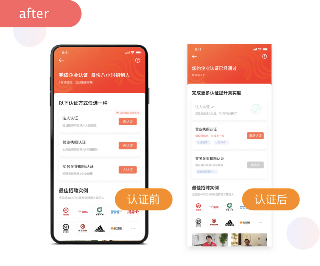 1、顶部用大面积的橘红色来吸引用户关注,传递重要信息:“完成认证你便可最快在8小时内招到人”。直接告诉用户,完成认证可以帮你提升招聘效率。