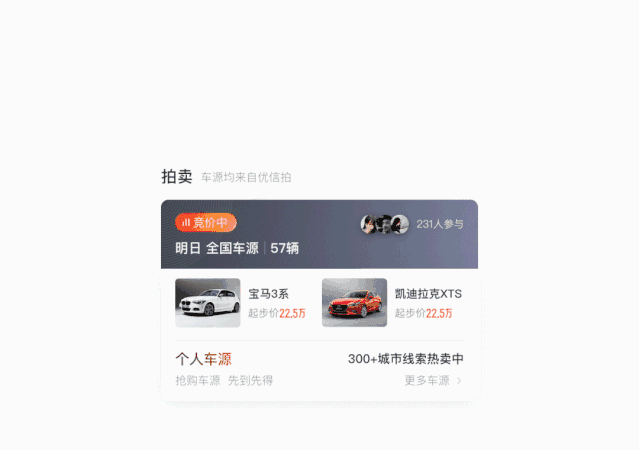 强化内容:拍卖版块内容场景(拍卖中)动态化、拍卖场次热度、消息-访客动图展示,实时传递增强互动性、氛围感,场景的高效触发,有助于提升用户决策效率。