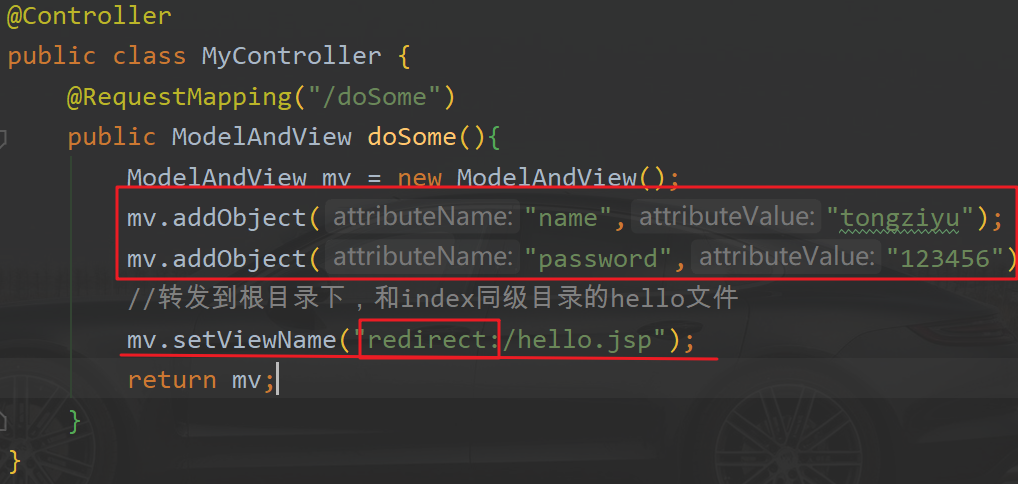 • 框架对重定向的操作:框架会把ModelAndView中的简单类型的数据,转为字符串使用,作为hello.jsp的get请求参数使用,