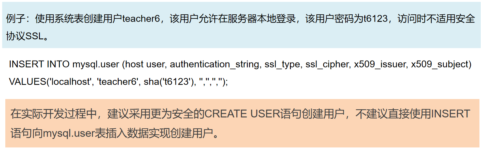 1.添加用户1.使用CREATE USER语句创建普通用户2.使用系统表创建普通用户2.查看用户1.使用系统表查看用户3.重命名用户账号1.使用RENAME USER语句重命名用户账号4.修改用户口令1.使用mysqladmin命令修改用户口令2.使用SET PASSWORD语句修改用户口令3.使用ALTER USER语句修改用户口令4.使用系统表修改用户口令5.删除用户1.使用DROP USER语句删除用户2.使用系统表删除用户 1.添加用户 1.使用CREATE USER语句创建普通用户 2.使用系统表创建普通用户 2.查看用户 1.使用系统表查看用户 3.重命名用户账号 1.使用RENAME USER语句重命名用户账号 4.修改用户口令 1.使用mysqladmin命令修改用户口令 2.使用SET PASSWORD语句修改用户口令 3.使用ALTER USER语句修改用户口令 4.使用系统表修改用户口令 5.删除用户 1.使用DROP USER语句删除用户 2.使用系统表删除用户