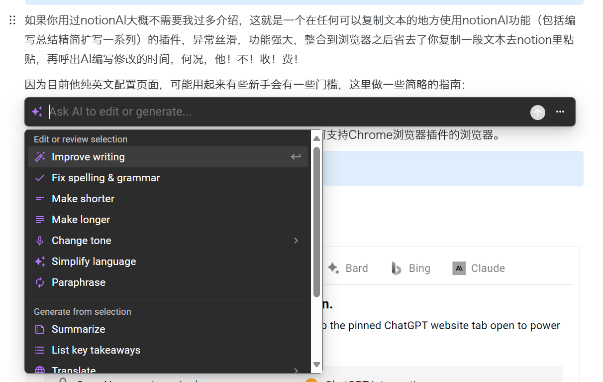 如果你用过notionAI大概不需要我过多介绍,这就是一个在任何可以复制文本的地方使用notionAI功能(包括编写总结精简扩写一系列)的插件,异常丝滑,功能强大,整合到浏览器之后省去了你复制一段文本去notion里粘贴,再呼出AI编写修改的时间,何况,他!不!收!费!