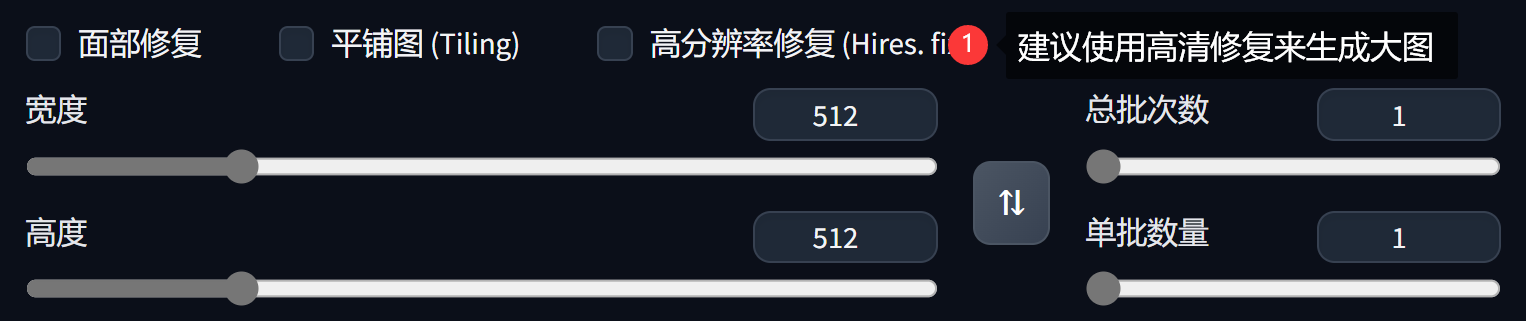 单批数量这个选项我一般不建议你调整,增大它可以让你每批次绘制的图像数量增多,理论上效率会更高。但它是同一批绘制的,方法是把它们拼在一起,看做一张更大的图片依次去画的。所以如果你的设备不好,非常容易爆显存,不如单批话少一点,再用更多的次数去解决这个问题。