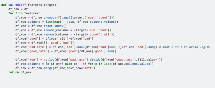 2021-07-03:根据读者反馈,修复了WOE公式计算代码,cal_WOE()函数原为下图:
