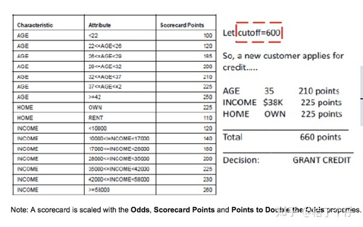 可以看到,这里有三个因素,第一个是年龄AGE,第二个是收入段INCOME,第三个是住宅HOME是租的还是买的。当总分超过600分,就给与授信额度。这种评分卡,操作简单,就算是个小学生都能算出风险值。