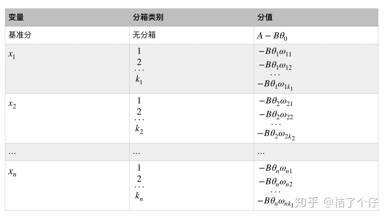 还记得前面举的评分卡例子吗?评分卡里每一个变量的每一个分箱有一个对应分值。前面的 是一个矩阵计算,展开后我们有: