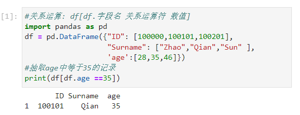 - 关系运算: df[df.字段名 关系运算符 数值]