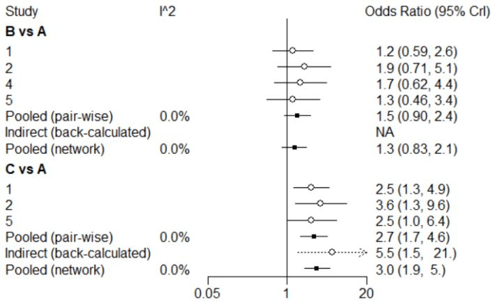 (由于篇幅原因,只给出干预措施A-D与E直接的森林图)