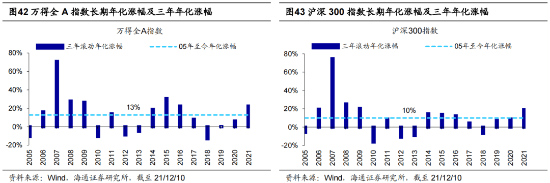 降低年度预期,重视岁末年初机会。长期来看,任何事物都存在着均值回归的规律,股市的运行也是如此。以2005年股权分置改革为起点,至今(截至2021/12/10)万得全A指数的年化收益率为13%,而回顾过去三年万得全A指数的涨跌幅分别为2019年33%、2020年26%、2021年至今10%,以19年初为起点,至今万得全A三年的年化涨幅为23%,已经明显高于历史均值。将万得全A指数替换成沪深300和普通股票型基金指数,我们也能得出同样的结论:沪深300(普通股票型基金指数)2005年以来年化涨幅约为10%(18%),19-21年三年的年化收益率为19%(38%),同样明显高于历史的均值。以牛熊周期的视角来衡量,我们将05年以来的行情分为05-12年、13-18年、19年至今三轮大熊牛周期并计算宽基指数(万得全A、沪深300及中证500)的收益率中枢,我们发现05-12年周期中各宽基指数的区间年化收益率在10%左右,13-18年5%左右,本轮则在15%左右,明显高于前两轮,因此明年股市可能难言系统性的大机会。综合来看我们认为明年指数会相对平淡,投资者需降低年度收益率的预期。