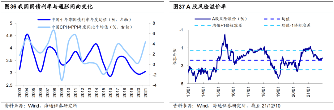 国际定价的大宗商品价格上行将推升全球通胀预期,货币政策难有宽松空间,美联储加息预期升温,根据Bloomberg的预测,22年下半年美联储加息概率较高,美国十年期国债利率中枢大概率上移。在全球经济同步性提升的背景下,08年底以来中美十年期国债利率基本正相关,美债利率的中枢上移,我国国债利率也难以下行。另外,借鉴历史,我国十年期国债利率年度均值和通胀年度均值(CPI和PPI的平均值)同步性较高,明年国内通胀压力仍存,十年期国债利率下行较难。从A股相对估值来看,风险溢价率(A股PE倒数与十年期国债收益率之差)为2.13%,13年以来(截至21/12/10,下同)均值为2.37%,股债收益比(沪深300股息率(过去12个月)/十年期国债收益率)为0.72,13年以来均值为0.71,可见当前股市与债市估值对比处于13年以来的均值附近。十年期国债利率难以下行,会制约A股估值。
