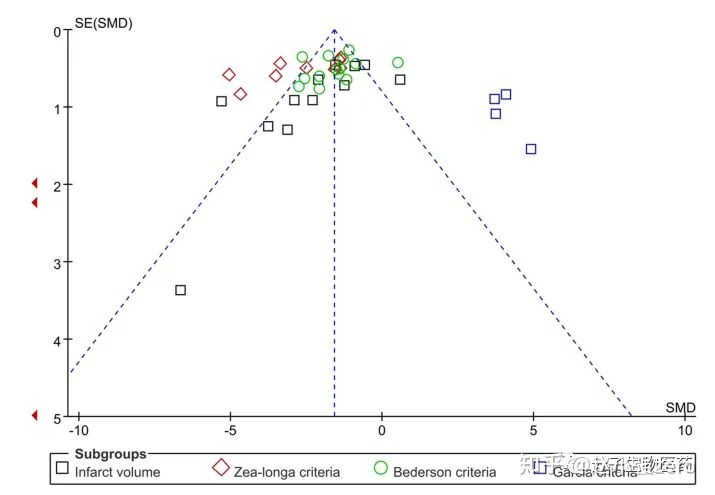 ②漏斗图:看是否对称来判断是否存在发表性偏倚。当存在发表性偏倚时, 则表现为漏斗图出现不对称, 则呈偏态分布。纳入文献10篇以上就需要做发表偏倚研究。