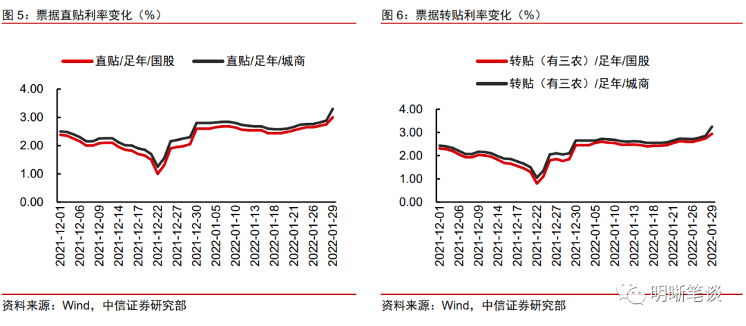 1月票据利率上行恐有他因。今年年初票据直贴与转贴利率中枢较12月明显抬高,月末甚至出现了快速上行,可能与银行信贷投放额度达标后票据冲量需求转弱有关。然而,从央行公布的贷款需求指数来看,整体上继续下行,1月信贷出现大幅反转的可能不大;此外,考虑到居民中长贷数据滞后于地产销售,因此去年12月居民中长贷同比少增的问题可能延续至1月。1月信贷可能难有超预期表现,直贴转贴利率大幅上行无法使用信贷放量来解释,因此直贴转贴利率大幅上行也可能与央行加强窗口指导,限制票据冲量行为有关。
