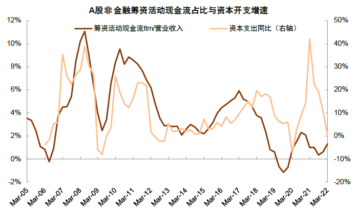 图表23:非金融资本开支增速大幅回落并在1Q22转负,但筹资现金流占比逐渐回升,或将逐渐产生支撑