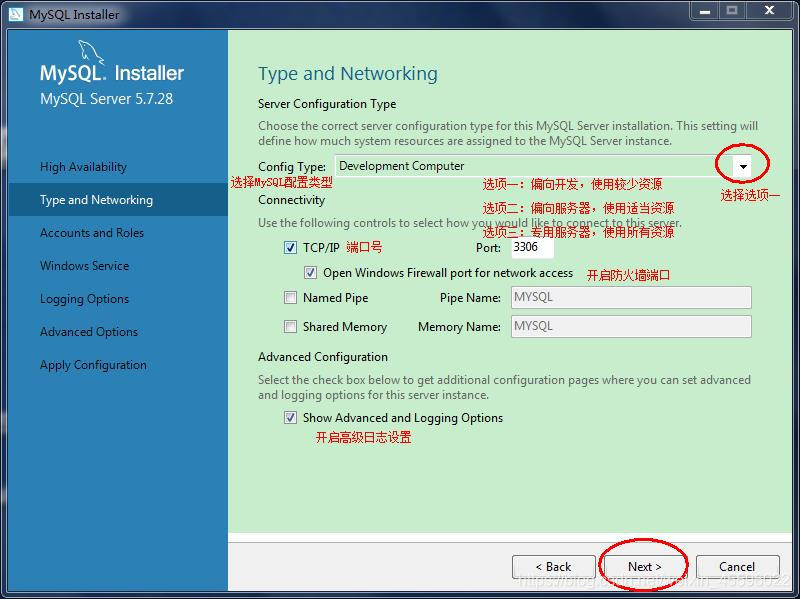- 将MySQL配置类型选择Development Computer开发电脑设置,点击Next下一步