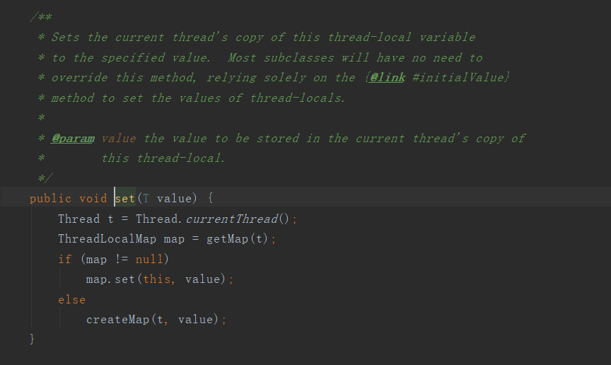 也就是说ThreadLocalMap的引用作为Thread的一个成员变量,被Thread进行维护的,回头看set()方法,当map为Null的时候会通过createMap(t,value)方法、