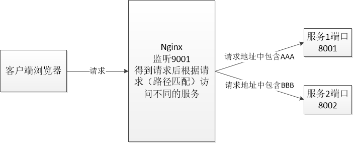 客户端发送请求到nginx服务器中,nginx服务器根据请求路径访问不同,访问不同的服务。