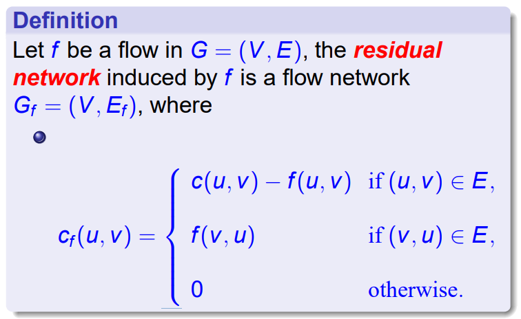一个流网络%3C%2Ftitle%3E%0A%3Cdefs%20aria-hidden%3D%22true%22%3E%0A%3Cpath%20stroke-width%3D%221%22%20id%3D%22E1-MJMATHI-47%22%20d%3D%22M50%20252Q50%20367%20117%20473T286%20641T490%20704Q580%20704%20633%20653Q642%20643%20648%20636T656%20626L657%20623Q660%20623%20684%20649Q691%20655%20699%20663T715%20679T725%20690L740%20705H746Q760%20705%20760%20698Q760%20694%20728%20561Q692%20422%20692%20421Q690%20416%20687%20415T669%20413H653Q647%20419%20647%20422Q647%20423%20648%20429T650%20449T651%20481Q651%20552%20619%20605T510%20659Q492%20659%20471%20656T418%20643T357%20615T294%20567T236%20496T189%20394T158%20260Q156%20242%20156%20221Q156%20173%20170%20136T206%2079T256%2045T308%2028T353%2024Q407%2024%20452%2047T514%20106Q517%20114%20529%20161T541%20214Q541%20222%20528%20224T468%20227H431Q425%20233%20425%20235T427%20254Q431%20267%20437%20273H454Q494%20271%20594%20271Q634%20271%20659%20271T695%20272T707%20272Q721%20272%20721%20263Q721%20261%20719%20249Q714%20230%20709%20228Q706%20227%20694%20227Q674%20227%20653%20224Q646%20221%20643%20215T629%20164Q620%20131%20614%20108Q589%206%20586%203Q584%201%20581%201Q571%201%20553%2021T530%2052Q530%2053%20528%2052T522%2047Q448%20-22%20322%20-22Q201%20-22%20126%2055T50%20252Z%22%3E%3C%2Fpath%3E%0A%3Cpath%20stroke-width%3D%221%22%20id%3D%22E1-MJMAIN-3D%22%20d%3D%22M56%20347Q56%20360%2070%20367H707Q722%20359%20722%20347Q722%20336%20708%20328L390%20327H72Q56%20332%2056%20347ZM56%20153Q56%20168%2072%20173H708Q722%20163%20722%20153Q722%20140%20707%20133H70Q56%20140%2056%20153Z%22%3E%3C%2Fpath%3E%0A%3Cpath%20stroke-width%3D%221%22%20id%3D%22E1-MJMAIN-28%22%20d%3D%22M94%20250Q94%20319%20104%20381T127%20488T164%20576T202%20643T244%20695T277%20729T302%20750H315H319Q333%20750%20333%20741Q333%20738%20316%20720T275%20667T226%20581T184%20443T167%20250T184%2058T225%20-81T274%20-167T316%20-220T333%20-241Q333%20-250%20318%20-250H315H302L274%20-226Q180%20-141%20137%20-14T94%20250Z%22%3E%3C%2Fpath%3E%0A%3Cpath%20stroke-width%3D%221%22%20id%3D%22E1-MJMATHI-56%22%20d%3D%22M52%20648Q52%20670%2065%20683H76Q118%20680%20181%20680Q299%20680%20320%20683H330Q336%20677%20336%20674T334%20656Q329%20641%20325%20637H304Q282%20635%20274%20635Q245%20630%20242%20620Q242%20618%20271%20369T301%20118L374%20235Q447%20352%20520%20471T595%20594Q599%20601%20599%20609Q599%20633%20555%20637Q537%20637%20537%20648Q537%20649%20539%20661Q542%20675%20545%20679T558%20683Q560%20683%20570%20683T604%20682T668%20681Q737%20681%20755%20683H762Q769%20676%20769%20672Q769%20655%20760%20640Q757%20637%20743%20637Q730%20636%20719%20635T698%20630T682%20623T670%20615T660%20608T652%20599T645%20592L452%20282Q272%20-9%20266%20-16Q263%20-18%20259%20-21L241%20-22H234Q216%20-22%20216%20-15Q213%20-9%20177%20305Q139%20623%20138%20626Q133%20637%2076%20637H59Q52%20642%2052%20648Z%22%3E%3C%2Fpath%3E%0A%3Cpath%20stroke-width%3D%221%22%20id%3D%22E1-MJMAIN-2C%22%20d%3D%22M78%2035T78%2060T94%20103T137%20121Q165%20121%20187%2096T210%208Q210%20-27%20201%20-60T180%20-117T154%20-158T130%20-185T117%20-194Q113%20-194%20104%20-185T95%20-172Q95%20-168%20106%20-156T131%20-126T157%20-76T173%20-3V9L172%208Q170%207%20167%206T161%203T152%201T140%200Q113%200%2096%2017Z%22%3E%3C%2Fpath%3E%0A%3Cpath%20stroke-width%3D%221%22%20id%3D%22E1-MJMATHI-45%22%20d%3D%22M492%20213Q472%20213%20472%20226Q472%20230%20477%20250T482%20285Q482%20316%20461%20323T364%20330H312Q311%20328%20277%20192T243%2052Q243%2048%20254%2048T334%2046Q428%2046%20458%2048T518%2061Q567%2077%20599%20117T670%20248Q680%20270%20683%20272Q690%20274%20698%20274Q718%20274%20718%20261Q613%207%20608%202Q605%200%20322%200H133Q31%200%2031%2011Q31%2013%2034%2025Q38%2041%2042%2043T65%2046Q92%2046%20125%2049Q139%2052%20144%2061Q146%2066%20215%20342T285%20622Q285%20629%20281%20629Q273%20632%20228%20634H197Q191%20640%20191%20642T193%20659Q197%20676%20203%20680H757Q764%20676%20764%20669Q764%20664%20751%20557T737%20447Q735%20440%20717%20440H705Q698%20445%20698%20453L701%20476Q704%20500%20704%20528Q704%20558%20697%20578T678%20609T643%20625T596%20632T532%20634H485Q397%20633%20392%20631Q388%20629%20386%20622Q385%20619%20355%20499T324%20377Q347%20376%20372%20376H398Q464%20376%20489%20391T534%20472Q538%20488%20540%20490T557%20493Q562%20493%20565%20493T570%20492T572%20491T574%20487T577%20483L544%20351Q511%20218%20508%20216Q505%20213%20492%20213Z%22%3E%3C%2Fpath%3E%0A%3Cpath%20stroke-width%3D%221%22%20id%3D%22E1-MJMAIN-29%22%20d%3D%22M60%20749L64%20750Q69%20750%2074%20750H86L114%20726Q208%20641%20251%20514T294%20250Q294%20182%20284%20119T261%2012T224%20-76T186%20-143T145%20-194T113%20-227T90%20-246Q87%20-249%2086%20-250H74Q66%20-250%2063%20-250T58%20-247T55%20-238Q56%20-237%2066%20-225Q221%20-64%20221%20250T66%20725Q56%20737%2055%20738Q55%20746%2060%20749Z%22%3E%3C%2Fpath%3E%0A%3C%2Fdefs%3E%0A%3Cg%20stroke%3D%22currentColor%22%20fill%3D%22currentColor%22%20stroke-width%3D%220%22%20transform%3D%22matrix(1%200%200%20-1%200%200)%22%20aria-hidden%3D%22true%22%3E%0A%20%3Cuse%20xlink%3Ahref%3D%22%23E1-MJMATHI-47%22%20x%3D%220%22%20y%3D%220%22%3E%3C%2Fuse%3E%0A%20%3Cuse%20xlink%3Ahref%3D%22%23E1-MJMAIN-3D%22%20x%3D%221064%22%20y%3D%220%22%3E%3C%2Fuse%3E%0A%20%3Cuse%20xlink%3Ahref%3D%22%23E1-MJMAIN-28%22%20x%3D%222120%22%20y%3D%220%22%3E%3C%2Fuse%3E%0A%20%3Cuse%20xlink%3Ahref%3D%22%23E1-MJMATHI-56%22%20x%3D%222510%22%20y%3D%220%22%3E%3C%2Fuse%3E%0A%20%3Cuse%20xlink%3Ahref%3D%22%23E1-MJMAIN-2C%22%20x%3D%223279%22%20y%3D%220%22%3E%3C%2Fuse%3E%0A%20%3Cuse%20xlink%3Ahref%3D%22%23E1-MJMATHI-45%22%20x%3D%223724%22%20y%3D%220%22%3E%3C%2Fuse%3E%0A%20%3Cuse%20xlink%3Ahref%3D%22%23E1-MJMAIN-29%22%20x%3D%224489%22%20y%3D%220%22%3E%3C%2Fuse%3E%0A%3C%2Fg%3E%0A%3C%2Fsvg%3E#card=math&code=G%3D%28V%2CE%29&id=qzwct)表示一个有向图,对于边(u,v)有一个非负的容量c(u,v)>0,无边则c(u,v)=0,不允许自环。有一个源点s和终点t。对于每一个顶点都存在从s出发到达t的路径。