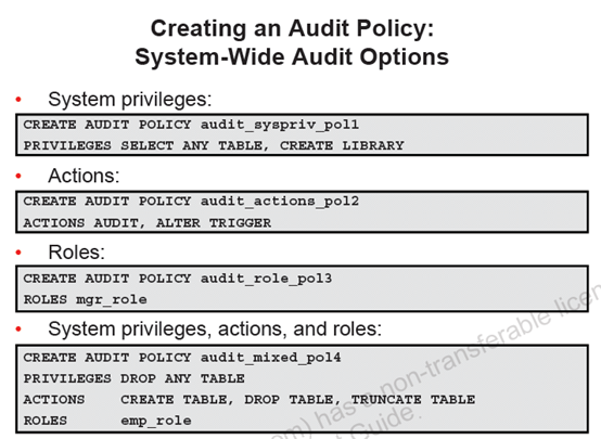 AUDIT select any table, create any trigger;AUDIT select any table BY hr BY SESSION;